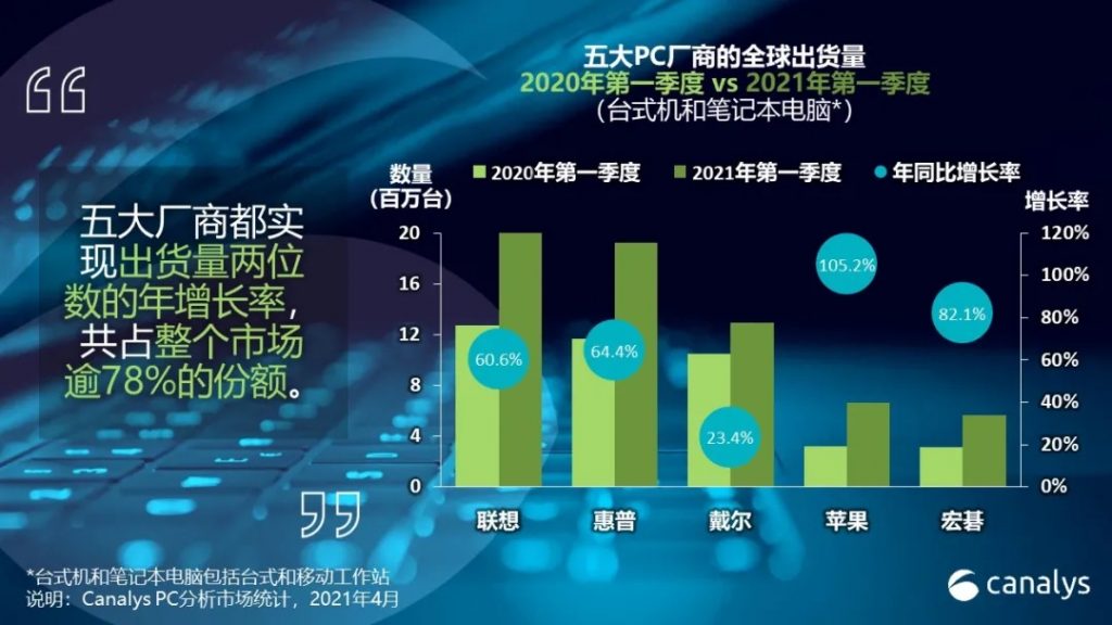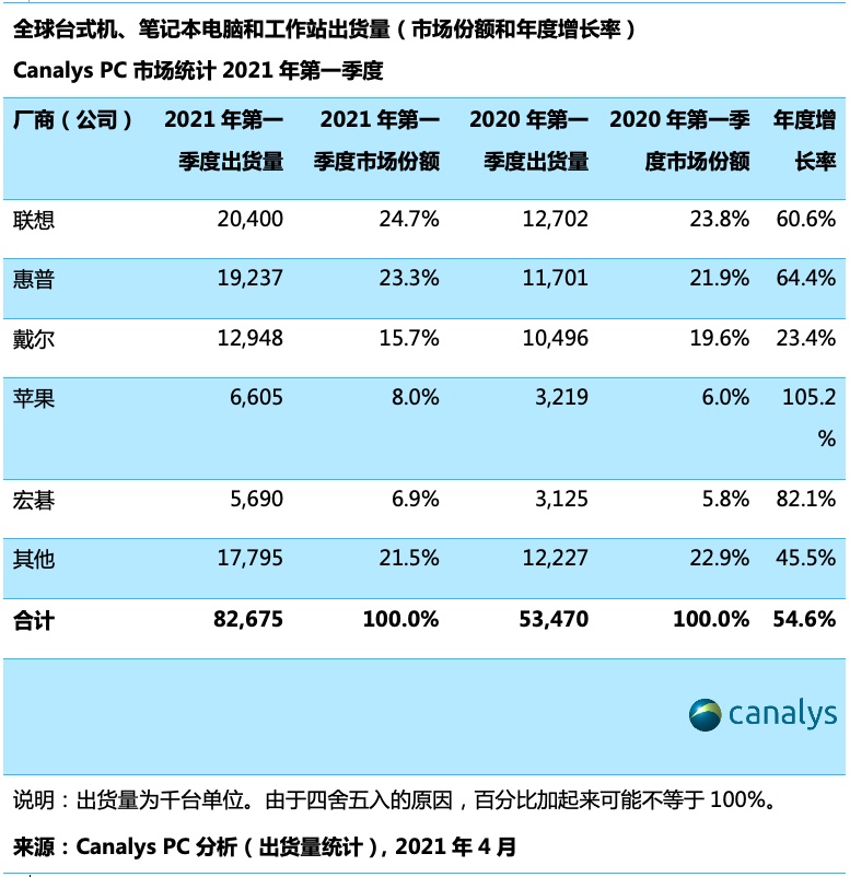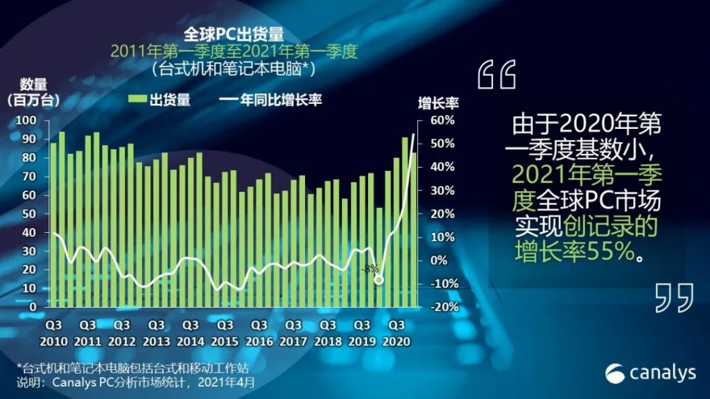 ,2021 年第一季度,全球 PC 商场持续坚持微弱的增加势头,台式机和笔记本电脑(包含工作站)的出货量年同比陡增 55%,到达 8270 万台。以下是陈述内容: