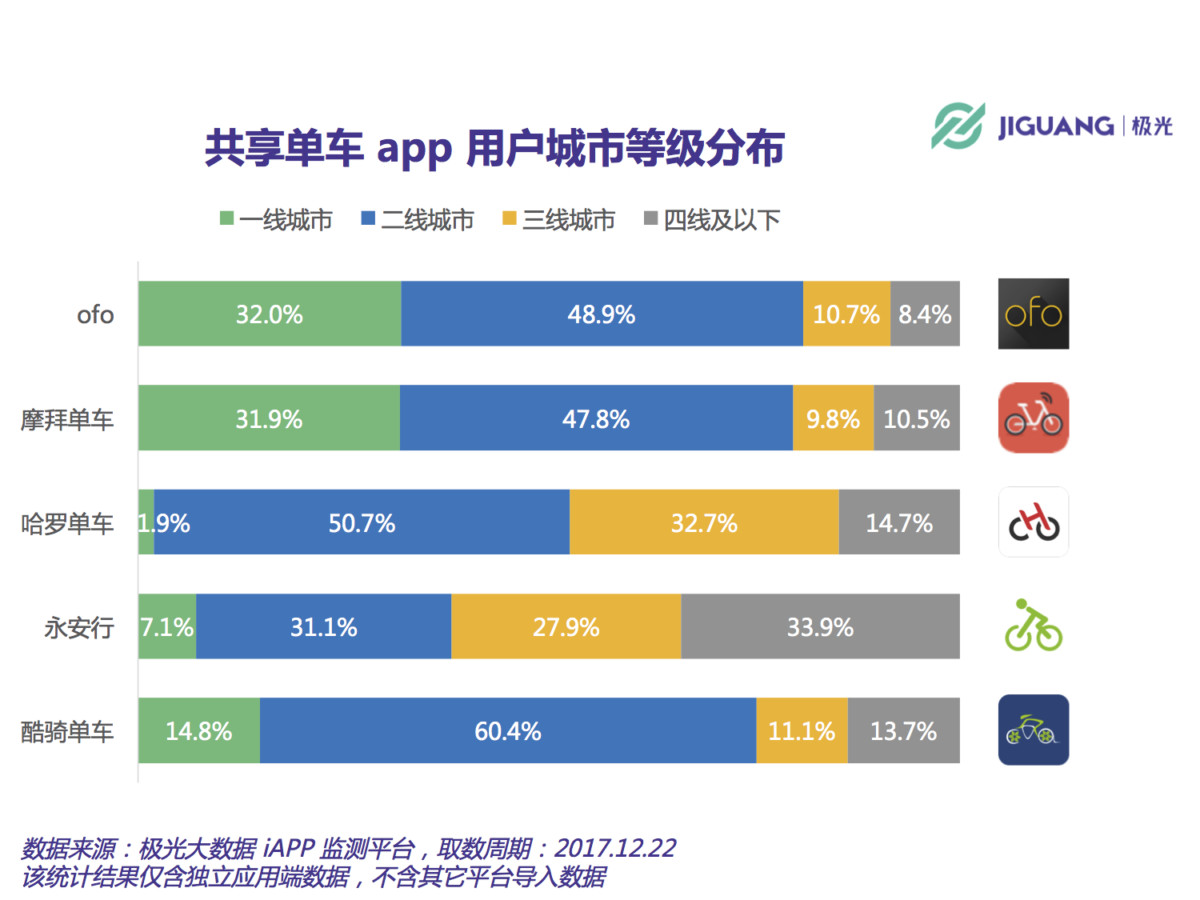 中国信通院陈述指出,当时多家同享单车现已完结一二线城市布局,开端要点转向三四线城市,但推行速度有所放缓。而极光大数据最新的一份“同享单车用户城市等级散布”陈述显现,哈罗单车在二三线及以下城市的用户散布份额到达98.1%,这在一切单车玩家中的份额是最高的。