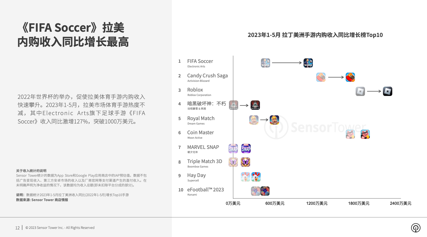 随同2022年世界杯的举行,拉美体育手游内购收入明显增加。2023年1至5月,Electronic Arts旗下足球手游《FIFA Soccer》收入同比激增127%,打破1000万美元,成为该商场收入增加最大的手游。