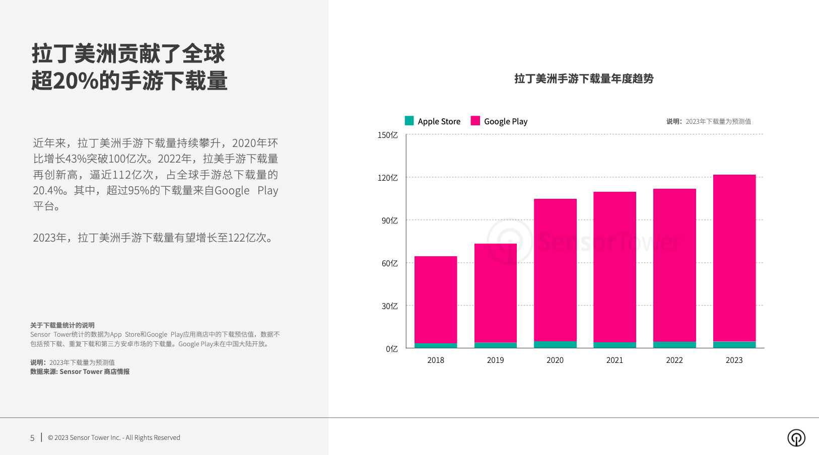依据Sensor Tower发布的数据,跟着智能手机的遍及,拉丁美洲手游下载量逐年增加,2022年贡献了全球超20%的手游下载量,挨近112亿次。估计2023年拉丁美洲手游下载量将到达122亿次。
