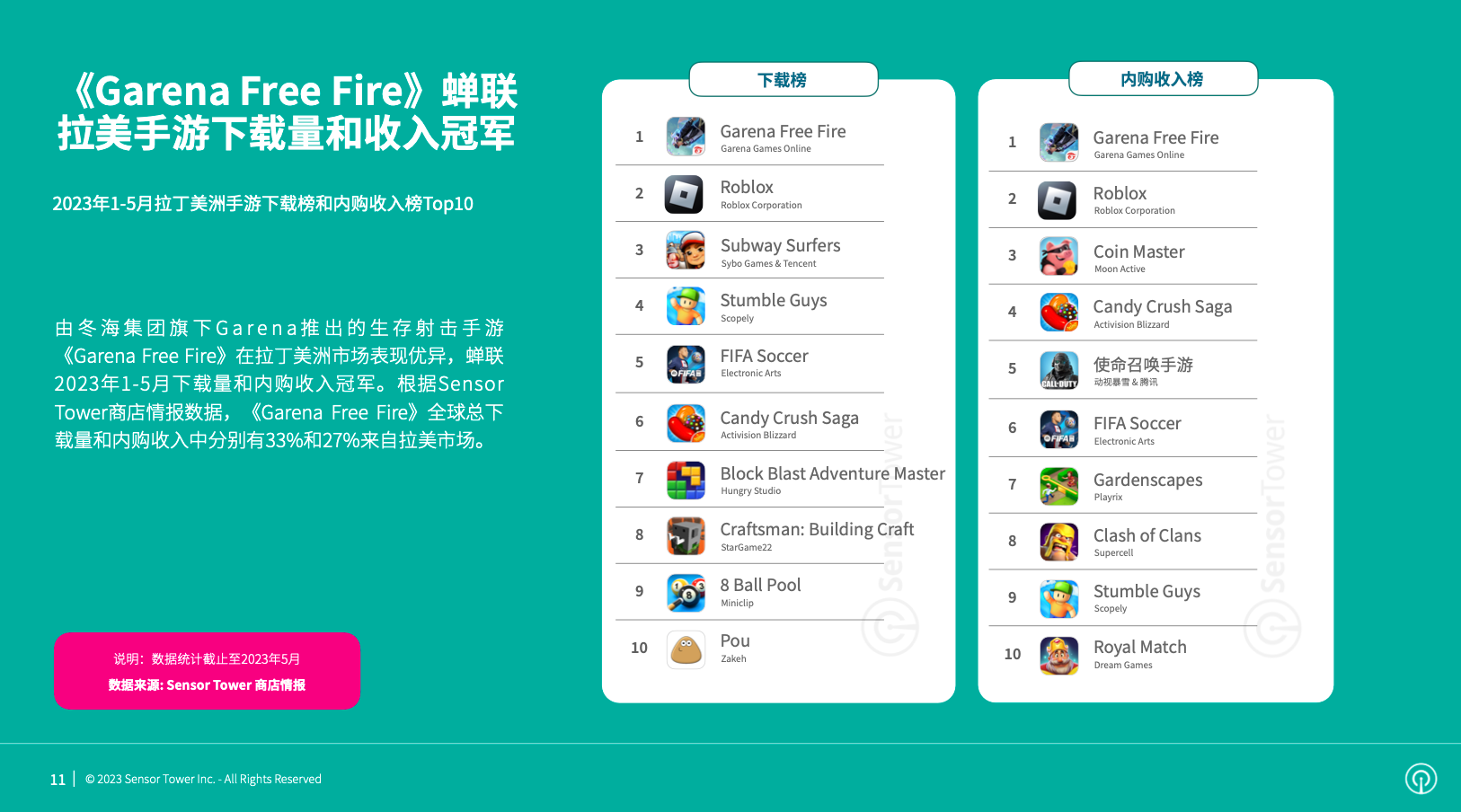 来自Garena的生计射击手游《Garena Free Fire》广受拉美玩家喜欢,稳居2023年1-5月下载榜和内购收入榜第一。Sensor Tower商铺情报数据显现,拉丁美洲别离贡献了《Garena Free Fire》33%的总下载量和27%的总收入。